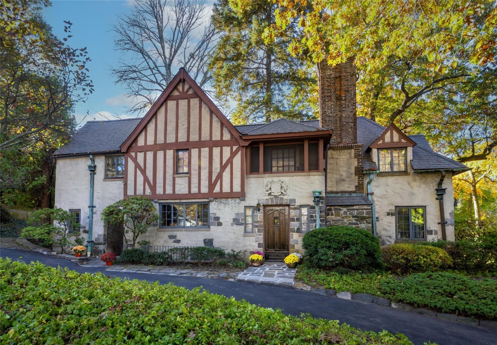 The carved limestone coat-of-arms etched with the words "You are always welcome at home" in Latin over a richly-detailed oak front door says it all. Welcome to 71 Flower, a picture-perfect 1925 updated Tudor that exudes charm through its authentic details: steep pitched roof, half-timbering, elaborate chimney, steel windows, and copper downspouts. Set on a corner lot in prestigious Riverview Manor, less than a block from the Old Croton Aqueduct, its curb-appeal is enhanced by mature greenery and a circular drive. Inside, the heart of the home is the extraordinary living room, flooded with light from its multiple windows on three sides. Here, the focus is on a breathtaking wood-burning fireplace with its impressive floor-to-ceiling carved plaster overmantel. That, along with hardwood floors, board-and-beamed ceiling, and multiple French doors, creates a space that you’ll never want to leave. An exterior set of French doors leads to both a back patio and a stone entertainment area at the gently-terraced rear yard. An elegant dining room offers wainscoted walls, wide-plank pegged wood floors, display cabinetry, and a bank of 5 casement windows summoning plenty of southern sun. Renovated with a chef in mind, a large eat-in kitchen features long granite counters, stainless appliances (including 6-burner Wolf range), ample storage, oak floors, and a convenient family dining area with service counter and door to driveway. Upstairs, find three unusually sunny bedrooms, where the gracious primary offers a deep walk-in closet and windows with three exposures - one with seasonal views of the Palisades. Walk out through steel French doors to your own private covered outdoor terrace! A modernized hall bath and ample cedar closet complete this level. On a walk-out lower level (an additional 460 SF), discover built-in desks and cabinetry (perfect for home office), a comfortable family room, storage and laundry rooms, and glass sliders to the lowest backyard stone veranda. Award-winning schools, two vibrant village downtowns, local Zinsser Park, and a 40-minute train to NYC are all icing on the cake. Come visit this wonderful Hastings home to fall under its enchanting spell.