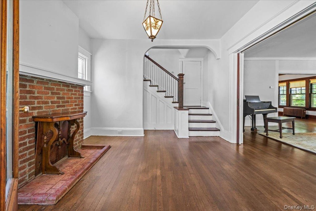 In a prime location, on a charming street, in one of the most desirable neighborhoods in Hastings on Hudson, 18 Elm Place is in the heart of the Village, just a few feet from the beloved Old Croton Aqueduct Trail and has a massive 32-foot covered front porch, complete with a classic, wood swing. Beyond the peaceful porch swing, there are many preserved aspects and details in this gem: hardwood floors throughout, coffered dining room ceiling, a cozy and adorable sunroom (which would make an inspiring home office or library), plus built-in shelving and a gracious foyer featuring one of the three fireplaces. The home is spacious and includes four, generously sized bedrooms, all on the second level. A fifth-bedroom option exists on the main level or it could be used as a family room or even a children's play room. There are two full-bathrooms, one on each floor. There is plenty of storage space in the full basement (where the laundry room also is), a full walk-up attic plus a 2-car detached garage. Very conveniently located in town, near the Metro North train, Zinsser Park, Reynolds Field, schools, library, restaurants, coffee shops and more, giving you easy access to all the bustling Village has to offer.